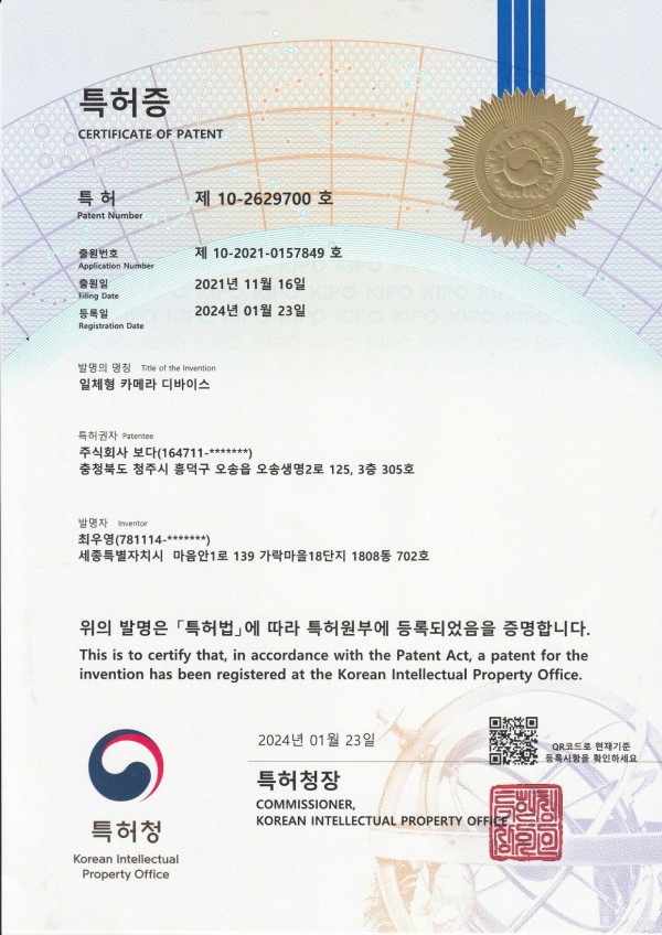 특허 특허증 10-2629700 페이지 정보 작성자 voda 댓글댓글 0건 조회조회 46회 작성일작성일 25-09-01 17:54 본문 특허증10-2629700-일제형 카메라 디바이스 첨부파일 특허증10-2629700 일제형 카메라 디바이스.pdf (1,018.6K) 0회 다운로드 | DATE : 2025-09-01 17:54:26 목록 이전글특허증 10-2701461 25.09.01 다음글특허증 10-2607512 25.09.01 댓글목록 댓글목록 등록된 댓글이 없습니다.