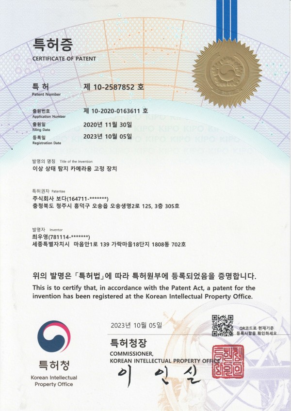 Patent 10-2587852 페이지 정보 작성자 voda ViewView 94 DateDate 25-09-01 17:53 본문 File 특허증10-2587852 이상 상태 탐지 카메라용 고정 장치.pdf (1,008.3K) 1 Download | DATE : 2025-09-01 17:53:21 List Prev10-2607512 25.09.01 Next10-2448957 25.09.01