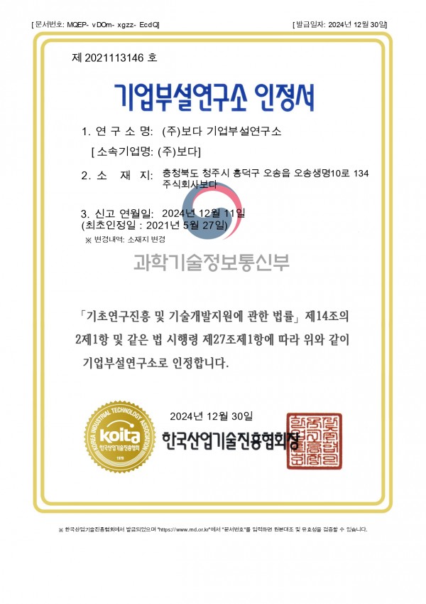 Certificate Certificate of Recognition for Company-Affiliated Research Institute 페이지 정보 작성자 voda ViewView 65 DateDate 25-09-01 17:27 본문 File 기업부설연구소 인정서.pdf (328.7K) 2 Download | DATE : 2025-09-01 17:27:22 List PrevWomen-Friendly Partner Company Agreement 25.09.01
